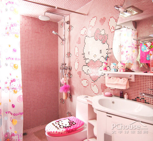 甜蜜KITTY小屋单从客厅装修看来已经让人非常SWEET。由于客厅不是很开敞,于是将厨房开放,两个空间用简单的吧台进行分割。配以圆弧形吊顶,使空间划分明确且不凌乱。